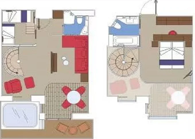 | YJD - Yacht Club Duplex Suite s vírivkou 46 m² + balkón 30 m². Vírivka. 2 podlažia, šatník, 2 kúpeľne (1 s vaňou). Max 4 osoby. 16. paluba. Cenový model MSC Yacht Club. | 9 682 € 4 841 € za osobu | ||