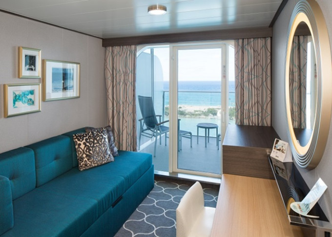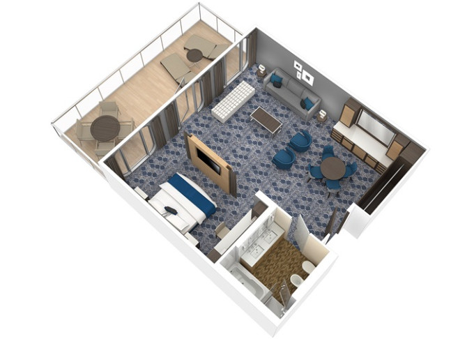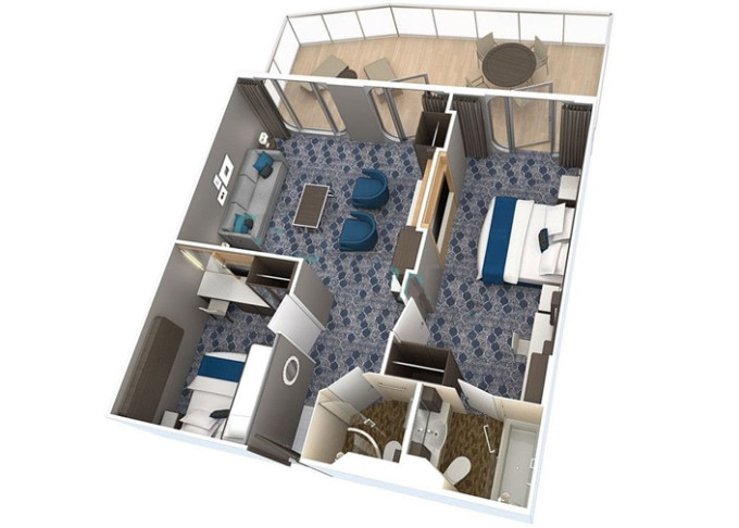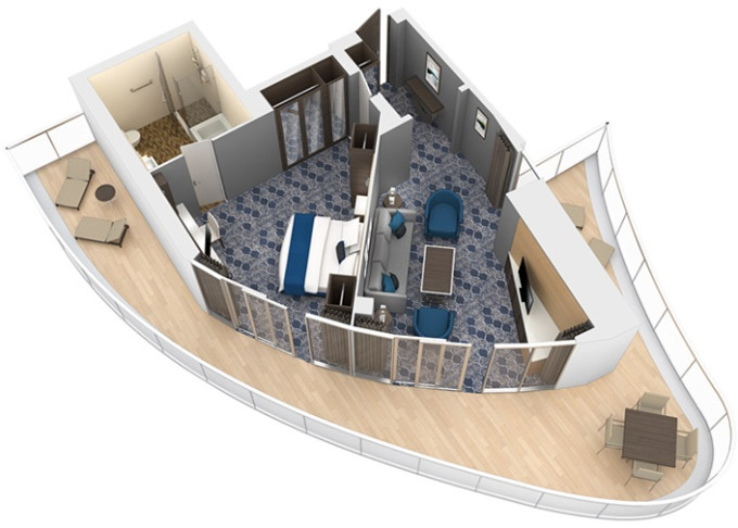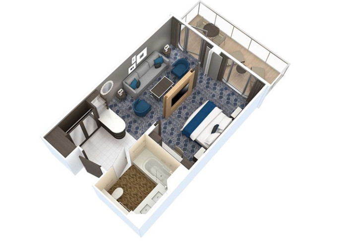 J3 - Junior Suite s balkónom 26,5 m² + balkón 7,5 m². Max 4-5 osôb. Výhody Royal Suite Sky Class. 5 215 € 5 215 € za osobu