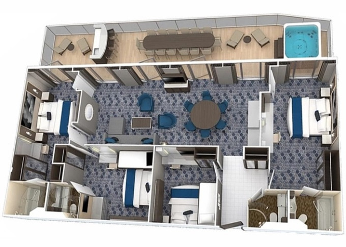 A1 - Spacious AquaTheater Suite s balkónom / 2 spálne 76 m² + balkón 72 m². 8. paluba. Max 8 osôb. Výhody Royal Suite Star Class. 20 700 € 10 350 € za osobu